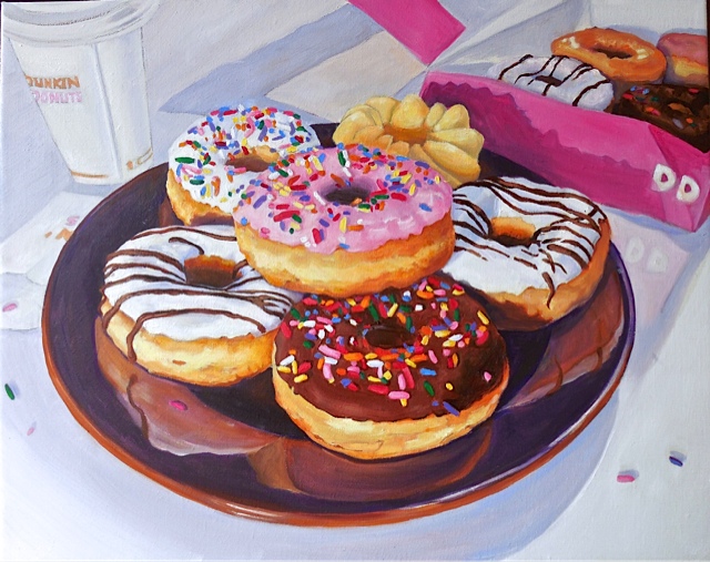 - 6 Dunkin’ Donuts on a Purple Plate, Oil on linen, 16 x 20 inches, SOLD