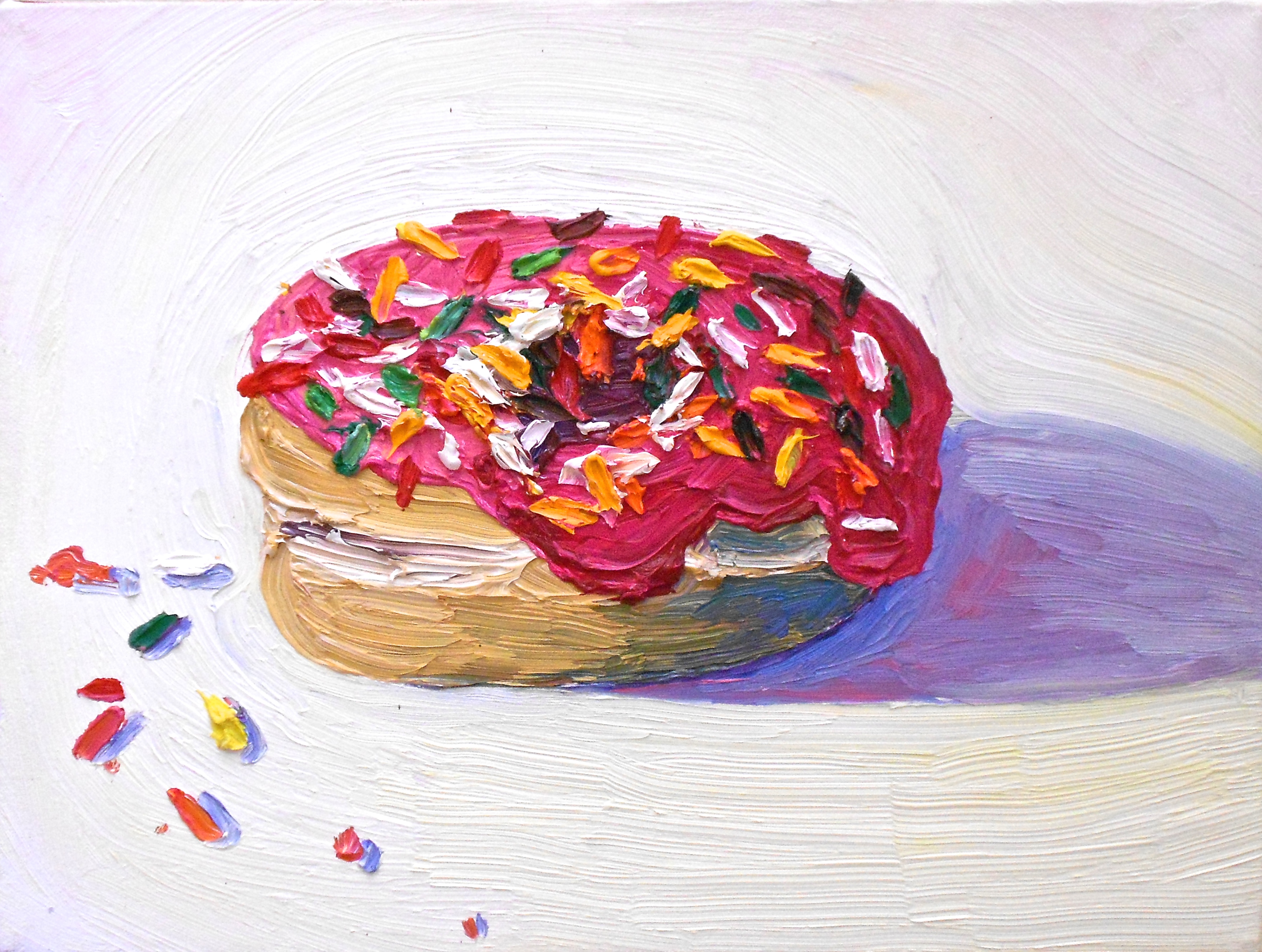 - Pink Dunkin’ Donut with Sprinkles, Oil on canvas, 9 x 12 inches, Not available